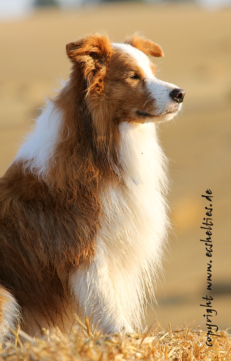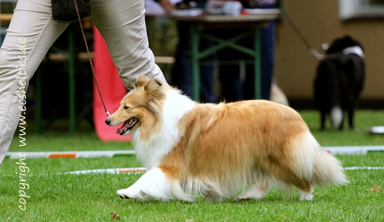 "Sable Hündin mit vorzüglicher Gesammterscheinung, sehr schöner Kopf und Ausdruck, sehr gut geschnittene dunkle Augen, korrekte Kippohren, vorzügliche Hals- und Rückenlinie, gut gewölbte Kruppe, korrekte Winklungen, einwandfrei im Stand, raumgreifend in der Bewegung,
