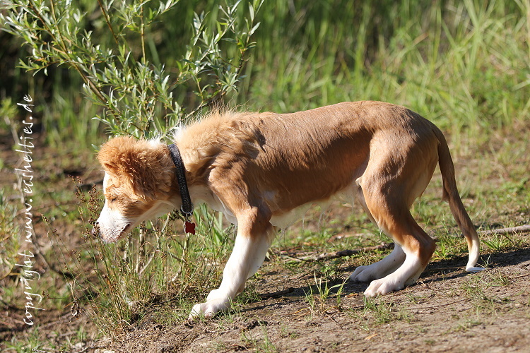 Thomas hatte Urlaub, wir haben daher viel mit dem kleinen Mann unternommen. Da "Forrest" ja ein "echter Border Collie" ist, stand eine "Berufsberatung" auf dem Plan, er lernte seine UrUrUr Väter kennen und "schnupperte" in andere Berufszweige hinein, er sah sich das Leben der Stadt-Hunde an , genoss die freie Zeit am Strand und , am aller wichtigsten, er bekam viel von seinem Vater beigebracht, der ihn natürlich überall hin begleitete.