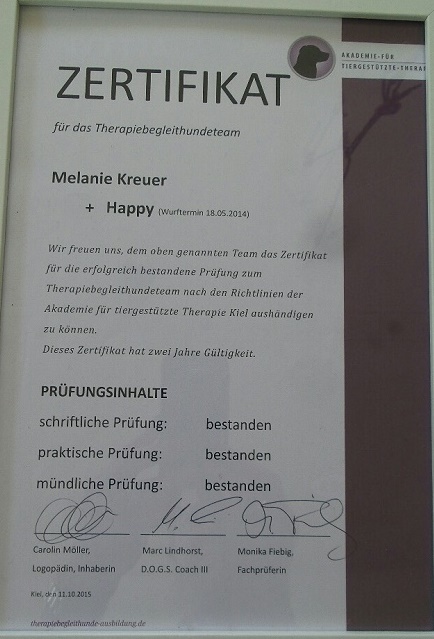 "Happy" besteht mit Frauchen Melanie die Prüfung zum Therapiehund !!! Wir sind super stolz auf diese tolle Leistung !!!